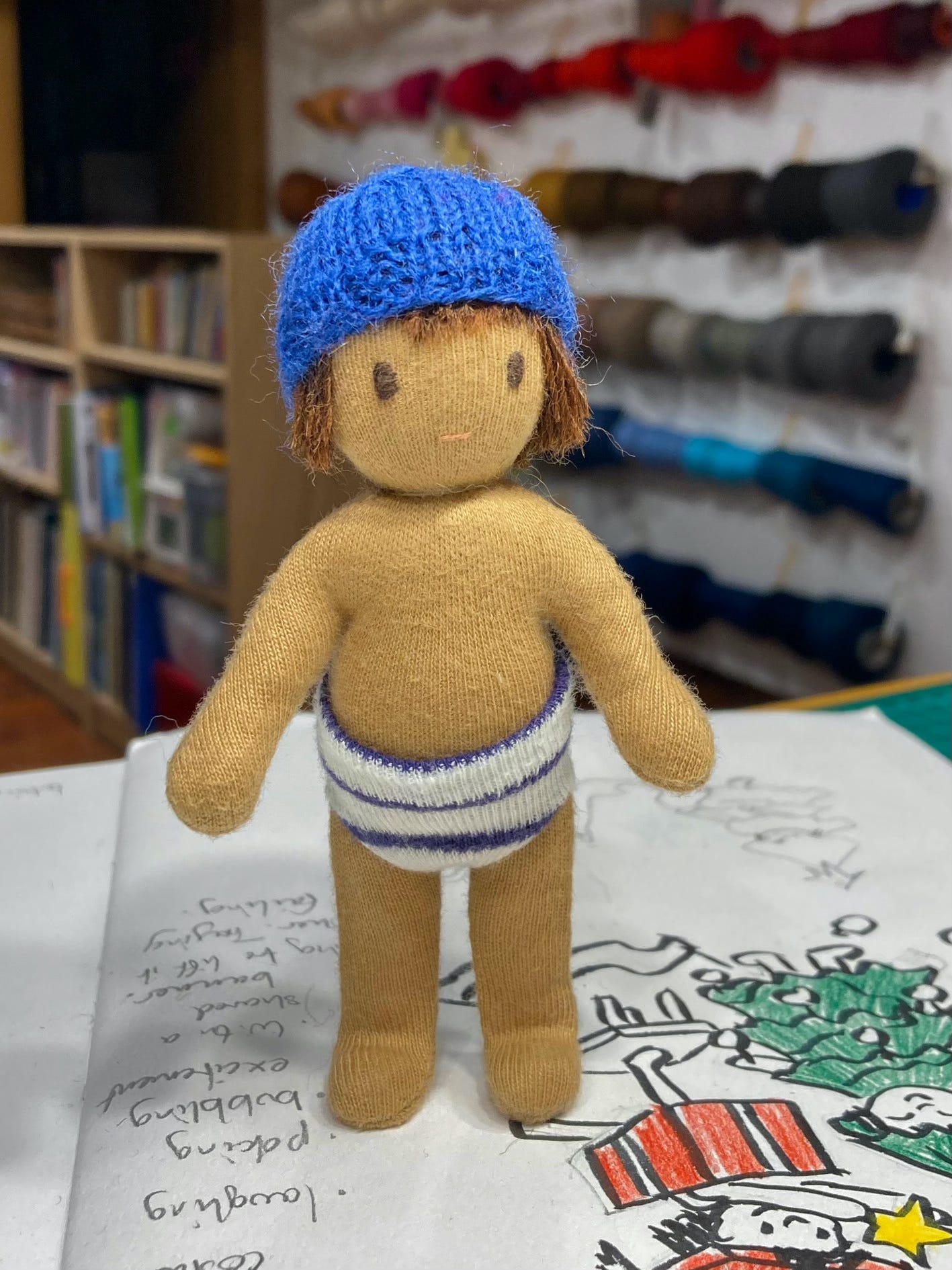 I’ve also been working towards the little festive dressing-up children sketches I showed you last week. Those I think will be a while in coming because I decided that I only had one (unfinished) doll in my collection that would suit the project, so I need to finish her and then make a second doll. Making actual dolls to photograph is a really slow way of creating illustrations, but once made I can use the dolls for several images and also little animations. This week, alongside the DIY distractions, I worked on first little doll’s hair and made her some pants. Everyone deserves pants in their life.