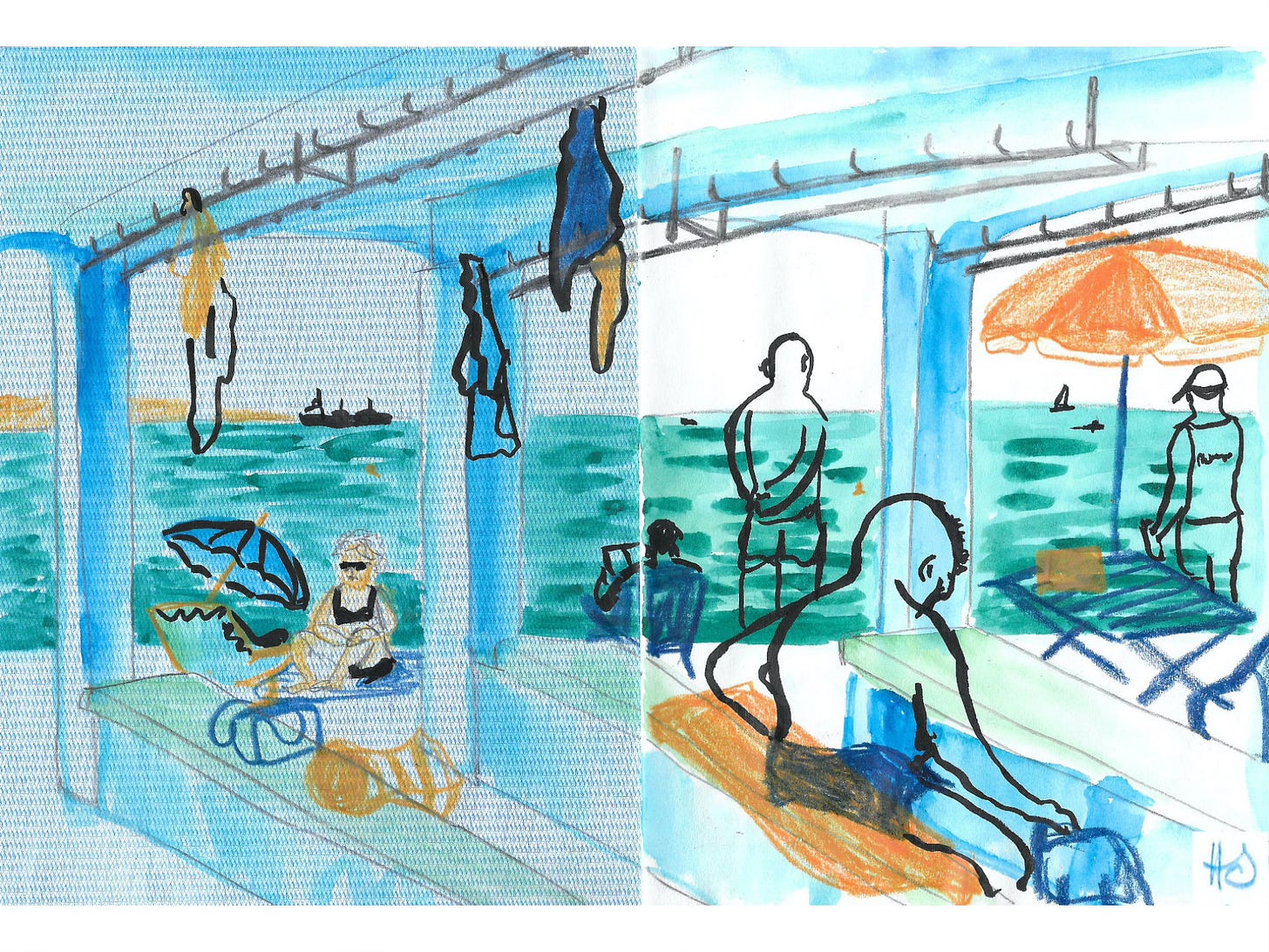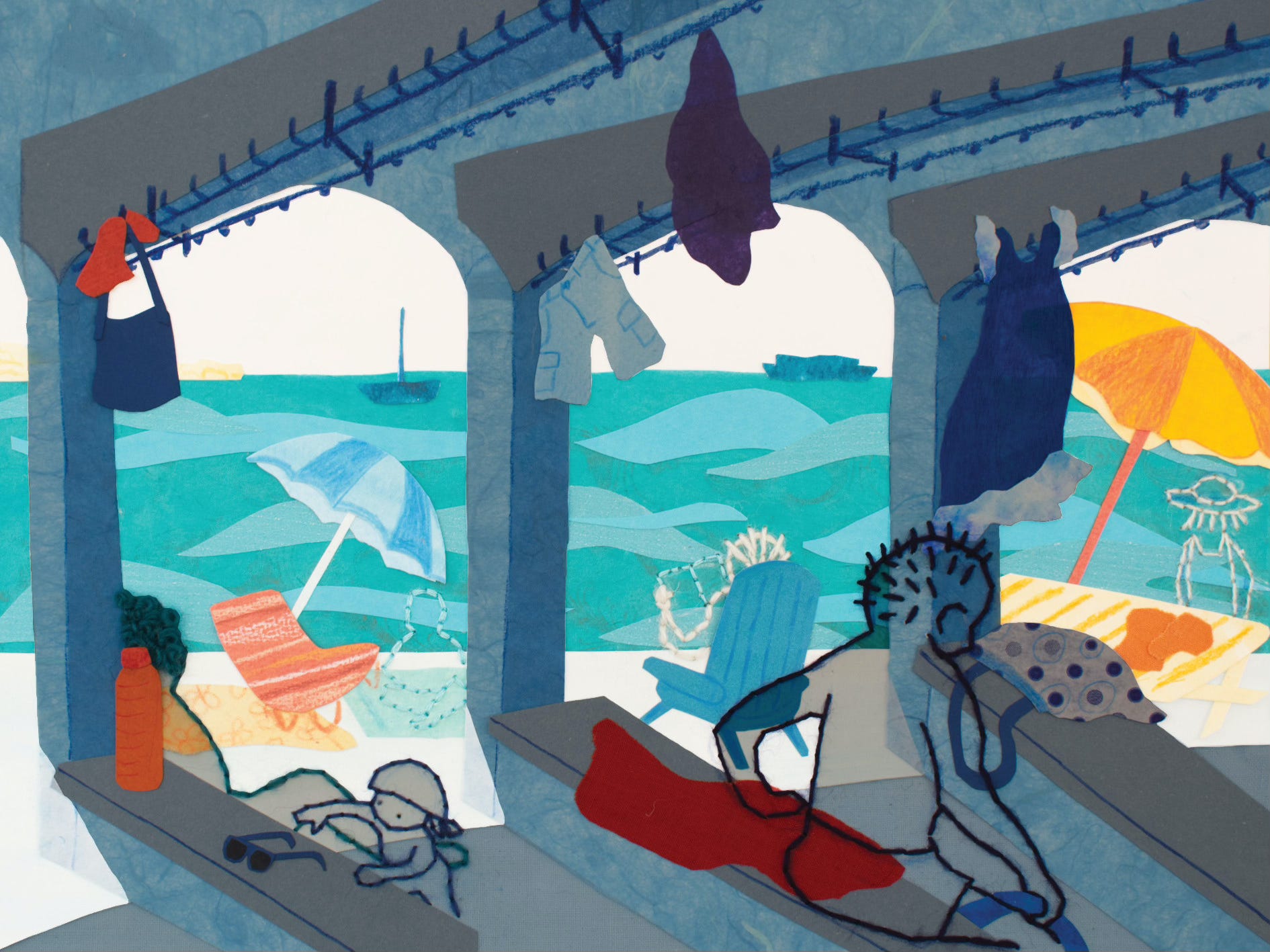 I hadn’t known how challenging those column perspectives were going to prove. I decided that I wanted to highlight the contrast between the darker, cooler, shady area in the foreground and the brighter, hotter background beside the water. I’ve swum here many times and am deeply grateful for that shade. I strongly remember the difference even just in the temperature of the concrete underfoot when you walk out of that shade, so I wanted to bring some of that across in the illustration. I’m pretty happy with the way it turned out. I adapted the clothes and figures a little bit and really enjoyed stitching the wooly character outlines. It’s a little different from my picture book work and I’m hoping it will be part of a future portfolio of work for editorial/advertising/design type projects. But I finished it, here’s the final work.